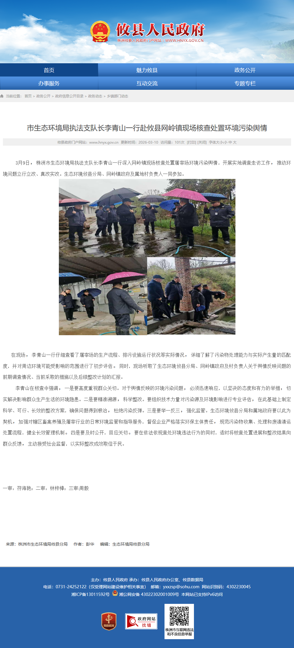 李青山在核查中强调,一是要高度重视群众关切。对于舆情反映的环境污染问题,必须迅速响应,以坚决的态度和有力的举措,切实解决影响群众生产生活的环境隐患。二是要精准溯源,科学整改。要组织技术力量对污染源及环境影响进行专业评估,在此基础上制定科学、可行、长效的整改方案,确保问题得到根治,杜绝污染反弹。三是要举一反三,强化监管。生态环境攸县分局和属地政府要以此为契机,加强对辖区畜禽养殖及屠宰行业的日常环境监管和指导服务,督促企业严格落实环保主体责任,规范污染物收集、处理和废渣清运处置流程,健全长效管理机制。四是要及时公开,回应关切。要在依法依规查处环境违法行为的同时,适时将核查处置进展和整改结果向群众反馈,主动接受社会监督,以实际整改成效取信于民。
