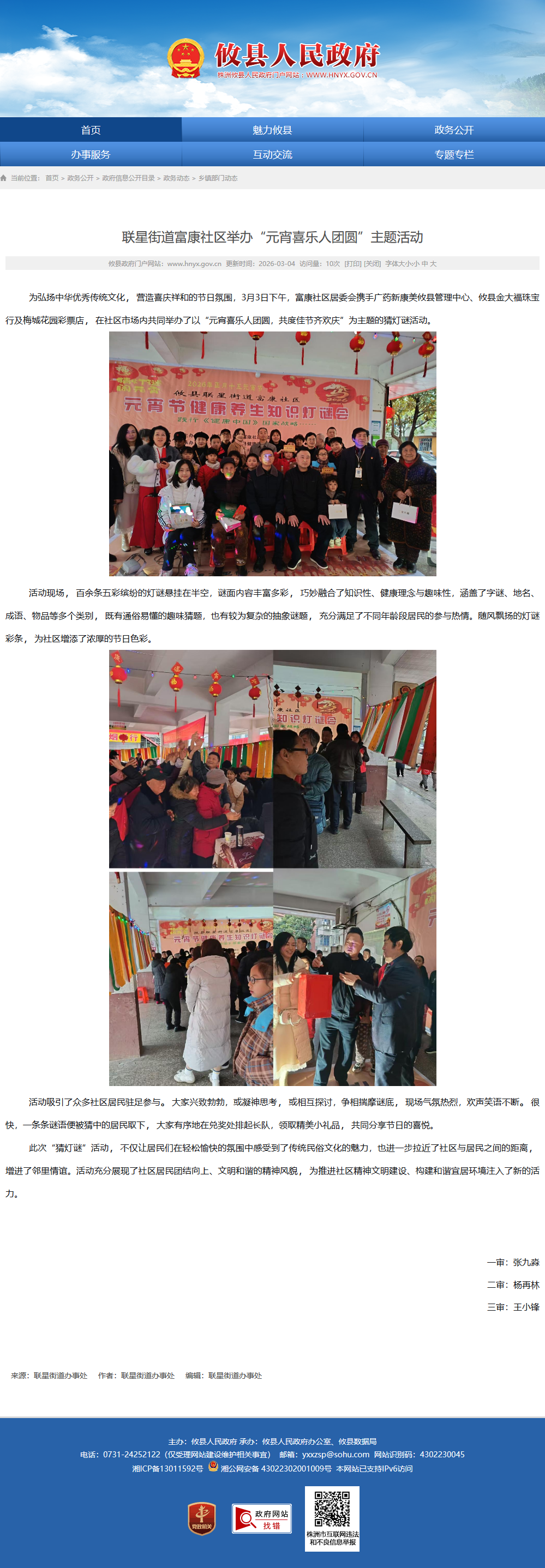 为弘扬中华优秀传统文化,营造喜庆祥和的节日氛围,3月3日下午,富康社区居委会携手广药新康美攸县管理中心、攸县金大福珠宝行及梅城花园彩票店,在社区市场内共同举办了以“元宵喜乐人团圆,共度佳节齐欢庆”为主题的猜灯谜活动。