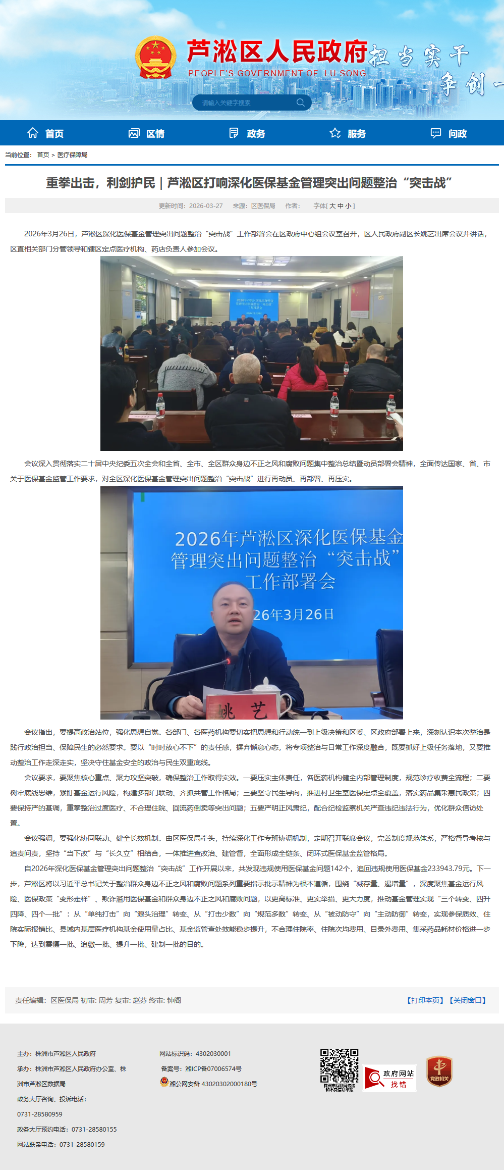 2026年3月26日,芦淞区深化医保基金管理突出问题整治“突击战”工作部署会在区政府中心组会议室召开,区人民政府副区长姚艺出席会议并讲话,区直相关部门分管领导和辖区定点医疗机构、药店负责人参加会议。