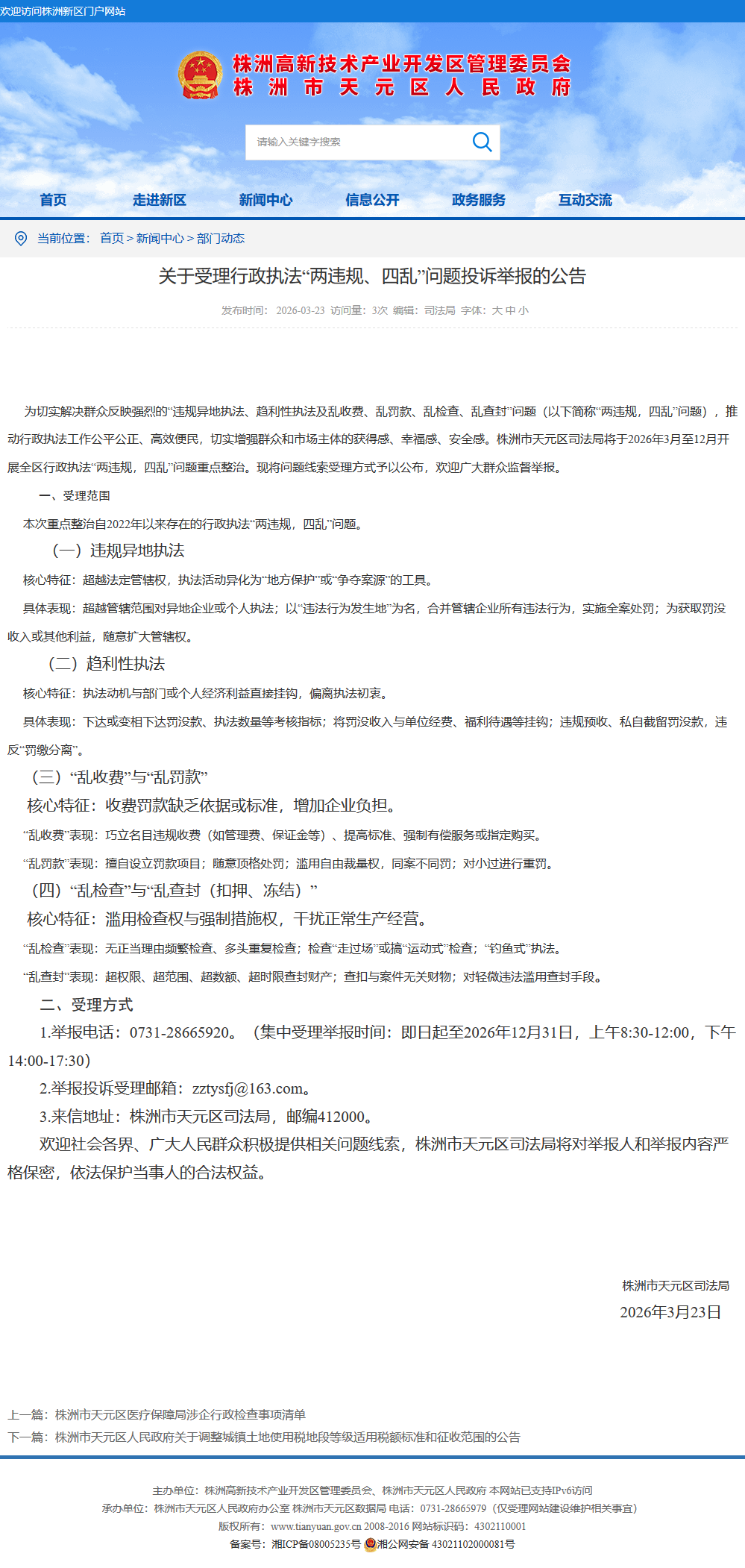 为切实解决群众反映强烈的“违规异地执法、趋利性执法及乱收费、乱罚款、乱检查、乱查封”问题(以下简称“两违规,四乱”问题),推动行政执法工作公平公正、高效便民,切实增强群众和市场主体的获得感、幸福感、安全感。株洲市天元区司法局将于2026年3月至12月开展全区行政执法“两违规,四乱”问题重点整治。现将问题线索受理方式予以公布,欢迎广大群众监督举报。
