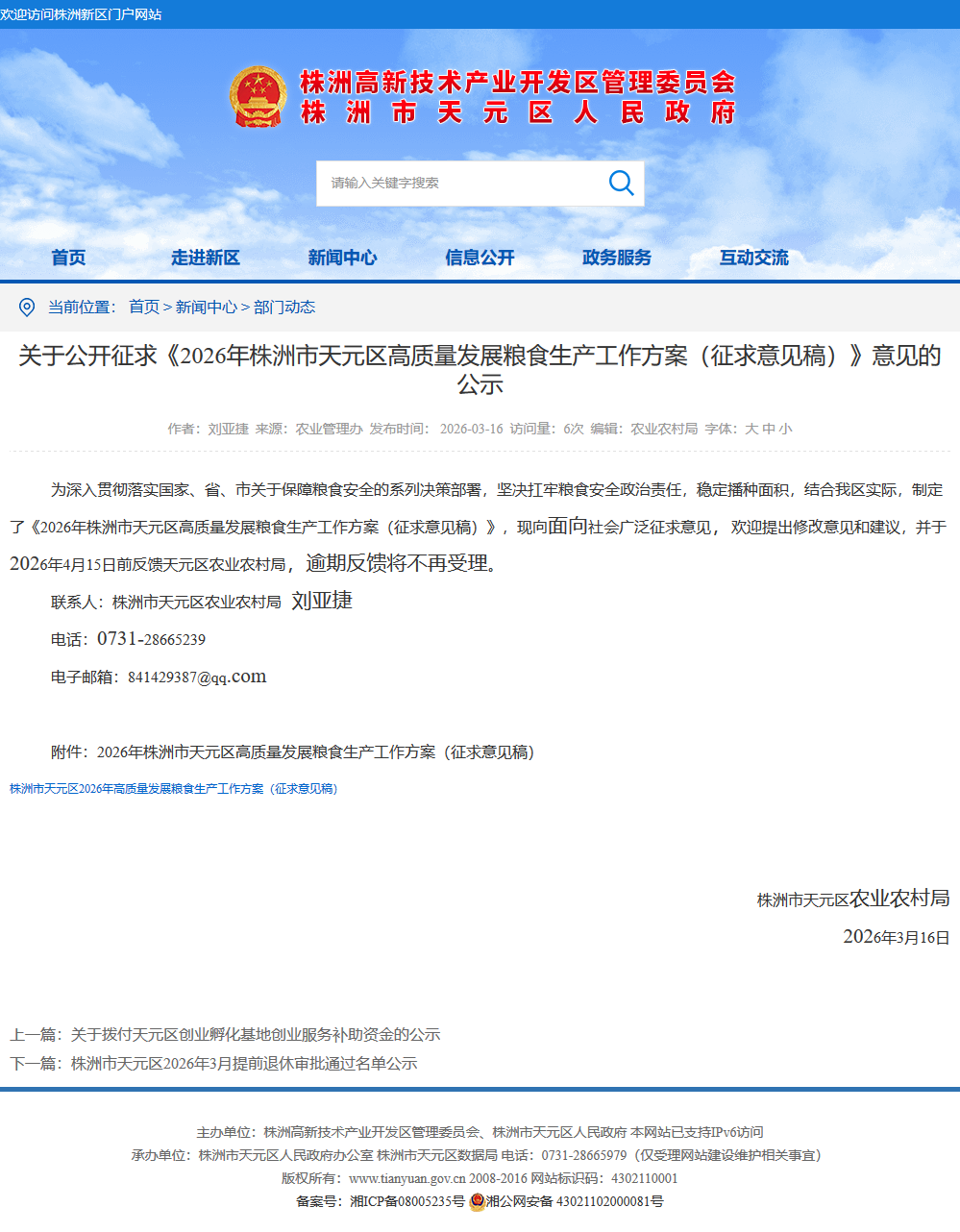 为深入贯彻落实国家、省、市关于保障粮食安全的系列决策部署,坚决扛牢粮食安全政治责任,稳定播种面积,结合我区实际,制定了《2026年株洲市天元区高质量发展粮食生产工作方案(征求意见稿)》,现向面向社会广泛征求意见,欢迎提出修改意见和建议,并于2026年4月15日前反馈天元区农业农村局,逾期反馈将不再受理。