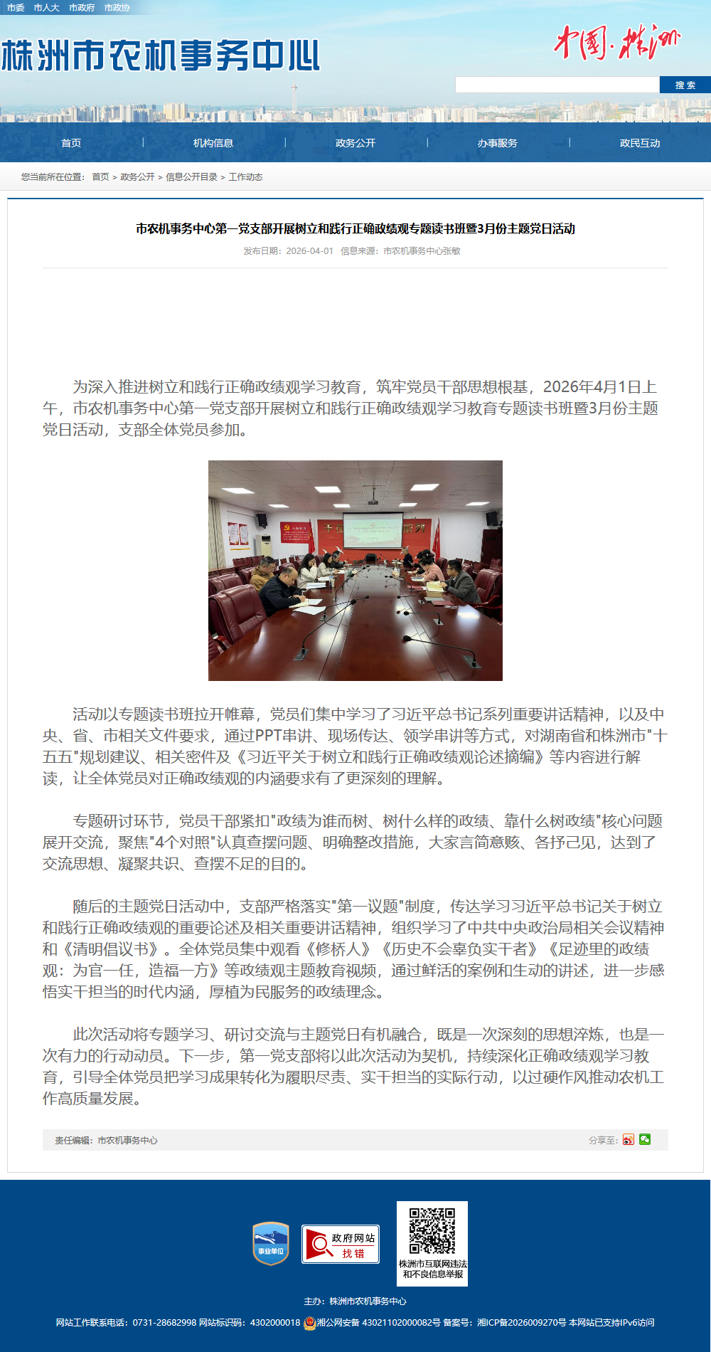 为深入推进树立和践行正确政绩观学习教育,筑牢党员干部思想根基,2026年4月1日上午,市农机事务中心第一党支部开展树立和践行正确政绩观学习教育专题读书班暨3月份主题党日活动,支部全体党员参加。
