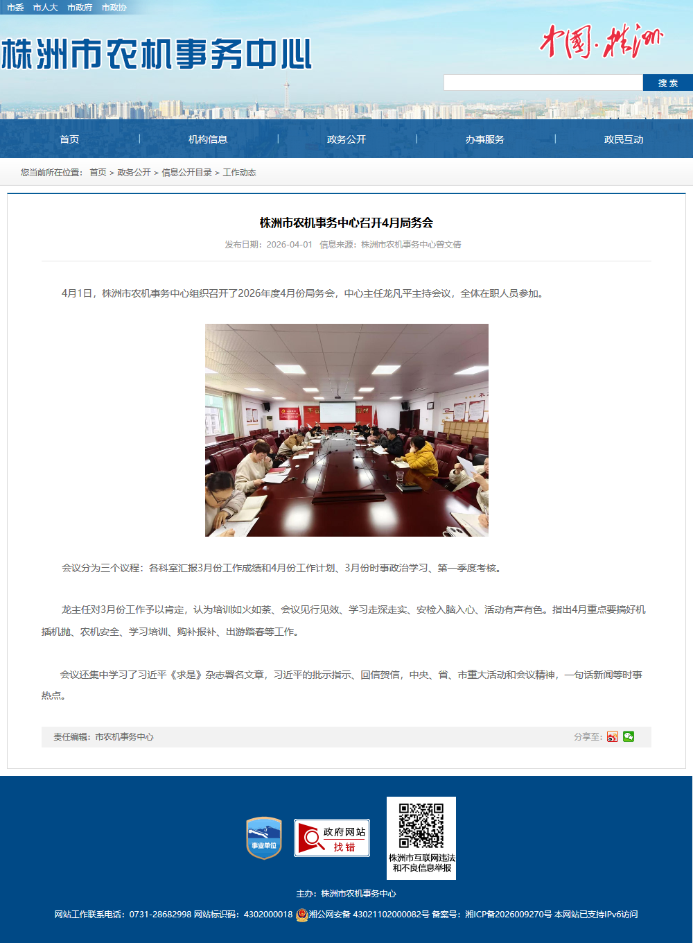 4月1日,株洲市农机事务中心组织召开了2026年度4月份局务会,中心主任龙凡平主持会议,全体在职人员参加。