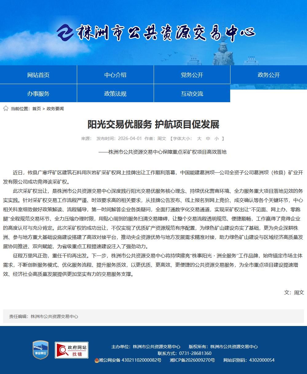 此次采矿权出让,是株洲市公共资源交易中心深度践行阳光交易优服务核心理念、持续优化营商环境、全力服务重大项目落地见效的务实实践。针对采矿权交易工作流程严谨、时效要求高的相关要求,从挂牌公告发布、线上报名到网上竞价、成交确认等各个关键环节,中心相关科室细致做好政策解读、流程辅导,第一时间解答企业各类疑问,全面打通数字化交易通道,实现采矿权出让“不见面、网上办、零跑腿”全程规范交易环节、全力压缩办理时限,用贴心周到的服务扫清交易障碍,让整个交易流程透明规范、便捷顺畅,工作赢得了竞得企业的高度认可与充分肯定。此次采矿权的成功出让,不仅实现了优质矿产资源规范有序配置,为绿色矿山建设夯实了基础,更为央企深耕株洲、参与地方重大基础设施建设搭建了高效对接平台,推动央企资源优势与地方发展需求精准对接,助力绿色矿山建设与区域经济高质量发展协同推进、双向赋能,为省级重点工程提速建设注入了强劲动力。