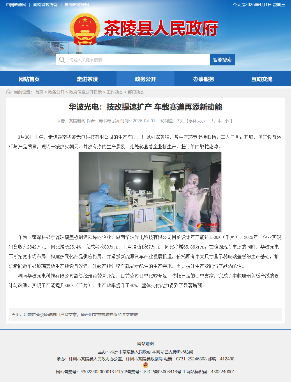 作为一家深耕显示器玻璃盖板制造领域的企业,湖南华波光电科技有限公司目前设计年产能达1500K(千片)。2025年,企业实现销售收入2842万元,同比增长25.4%;完成税收80万元,其中增值税67万元,同比净增65.86万元。在稳固现有市场的同时,华波光电不断拓宽市场布局,构建多元化产品供应格局,并紧抓新能源汽车产业发展机遇,依托原有中大尺寸显示器玻璃盖板的生产基础,推进新能源车显玻璃盖板生产线设备改造,升级产线适配车载显示配件的生产需求,全力提升生产效能与产品适配性。