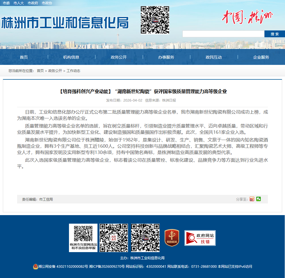 日前,工业和信息化部办公厅正式公布第二批质量管理能力高等级企业名单,我市湖南新世纪陶瓷有限公司成功上榜,成为湖南本次唯一入选该名单的企业。