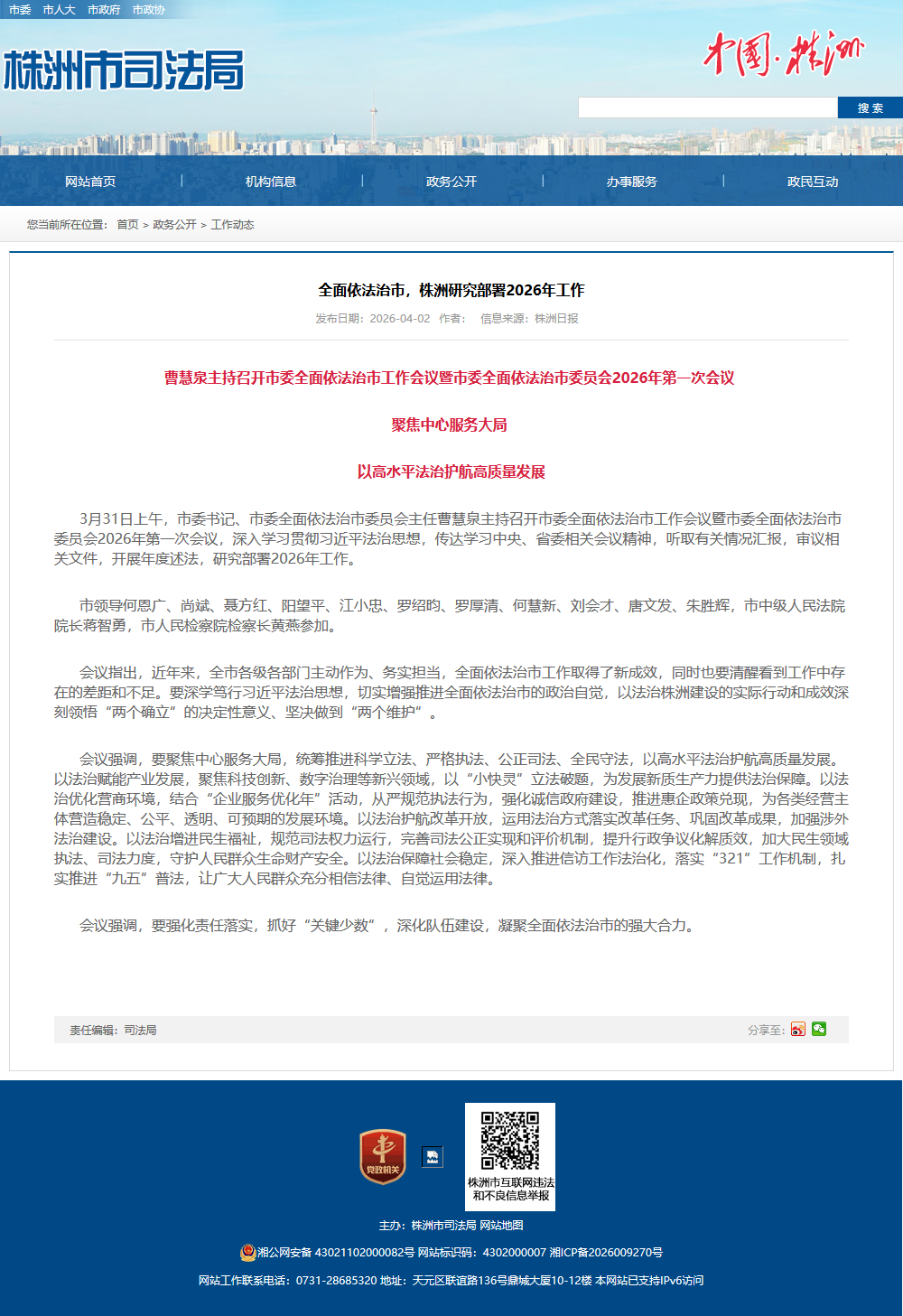 会议指出,近年来,全市各级各部门主动作为、务实担当,全面依法治市工作取得了新成效,同时也要清醒看到工作中存在的差距和不足。要深学笃行习近平法治思想,切实增强推进全面依法治市的政治自觉,以法治株洲建设的实际行动和成效深刻领悟“两个确立”的决定性意义、坚决做到“两个维护”。