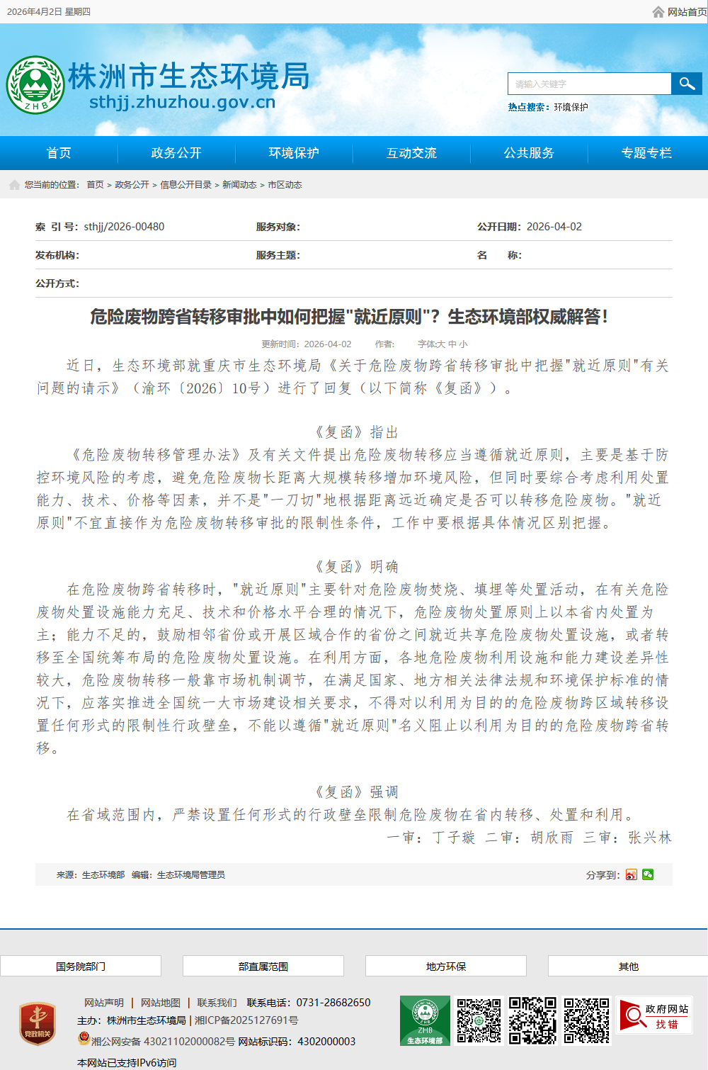 近日,生态环境部就重庆市生态环境局《关于危险废物跨省转移审批中把握"就近原则"有关问题的请示》(渝环〔2026〕10号)进行了回复(以下简称《复函》)。