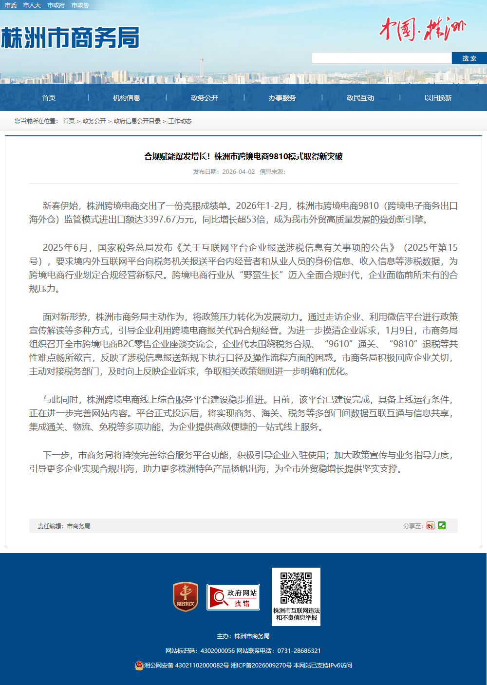 新春伊始,株洲跨境电商交出了一份亮眼成绩单。2026年1-2月,株洲市跨境电商9810(跨境电子商务出口海外仓)监管模式进出口额达3397.67万元,同比增长超53倍,成为我市外贸高质量发展的强劲新引擎。