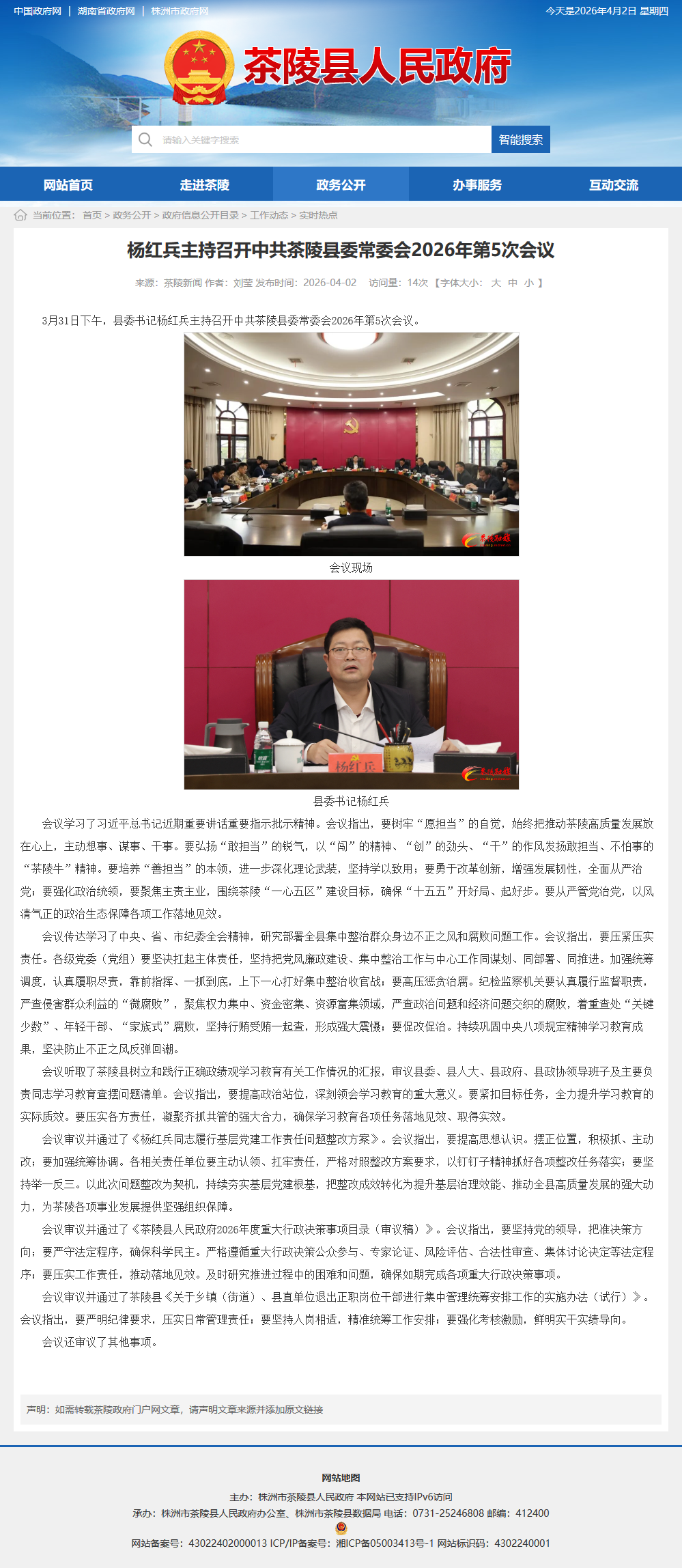 3月31日下午,县委书记杨红兵主持召开中共茶陵县委常委会2026年第5次会议。