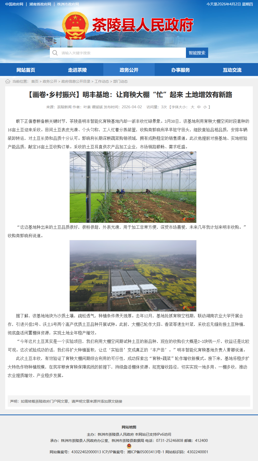 眼下正值春耕备耕关键时节,茶陵县明丰智能化育秧基地内却一派丰收忙碌景象。3月30日,该基地利用育秧大棚空闲时段套种的16亩土豆迎来采收。田间土豆表皮光滑、个头匀称,工人忙着分拣装筐,收购商郭晓利早早驻守田头,细致查验品相品质,安排车辆装卸转运,对土豆长势和品质十分认可。郭晓利长期深耕蔬菜购销领域,拥有成熟稳定的销售渠道。此次他提前对接基地、实地核验产能品质,敲定16亩土豆收购订单。采收的土豆将直供农产品加工企业,市场销路顺畅、需求旺盛。