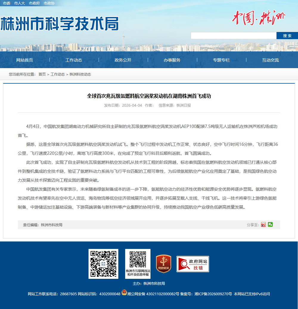 4月4日,中国航发集团湖南动力机械研究所自主研制的兆瓦级氢燃料航空涡桨发动机AEP100配装7.5吨级无人运输机在株洲芦淞机场成功首飞。