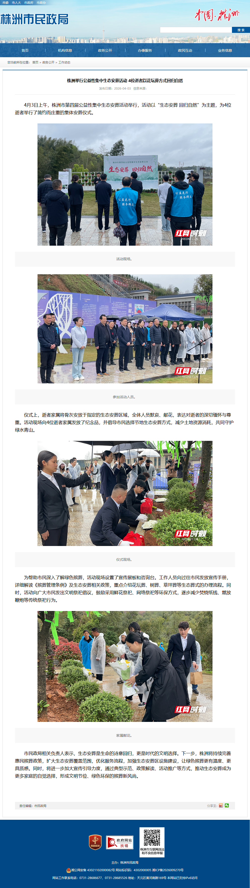 4月3日上午,株洲市第四届公益性集中生态安葬活动举行,活动以“生态安葬 回归自然”为主题,为4位逝者举行了简约而庄重的集体安葬仪式。