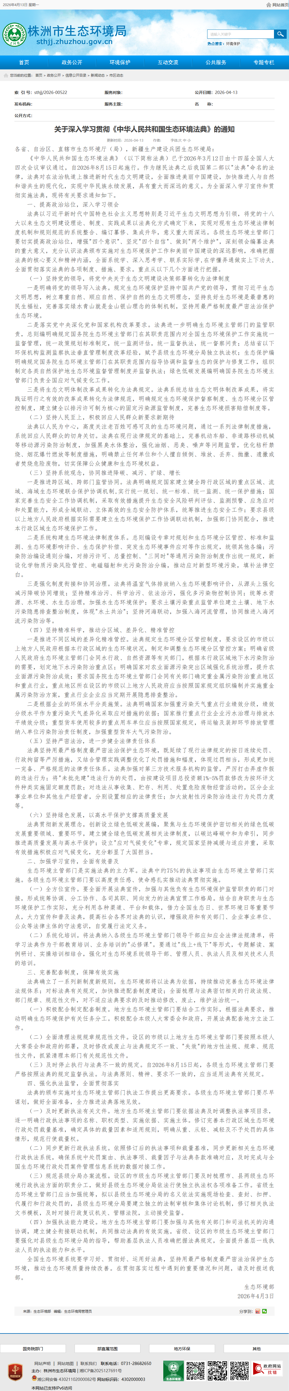 《中华人民共和国生态环境法典》(以下简称法典)已于2026年3月12日由十四届全国人大四次会议审议通过,自2026年8月15日起施行。作为继民法典之后我国第二部以"法典"命名的法律,法典对在法治轨道上推进新时代生态文明建设,全面推进美丽中国建设,加快推进人与自然和谐共生的现代化,实现中华民族永续发展,具有重大而深远的意义。为全面深入学习宣传和贯彻实施法典,现将有关要求通知如下。