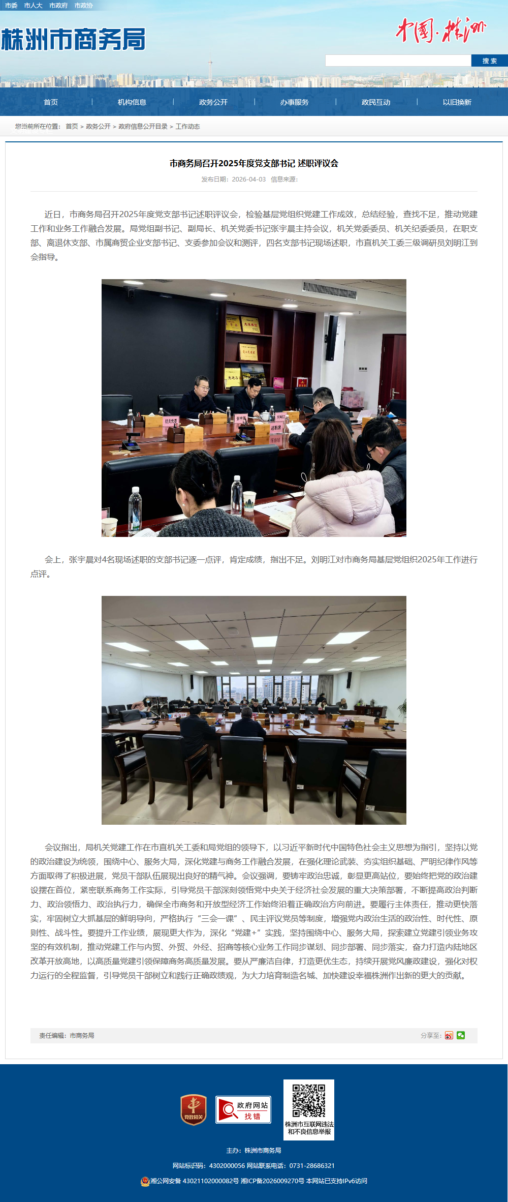 会上,张宇晨对4名现场述职的支部书记逐一点评,肯定成绩,指出不足。刘明江对市商务局基层党组织2025年工作进行点评。