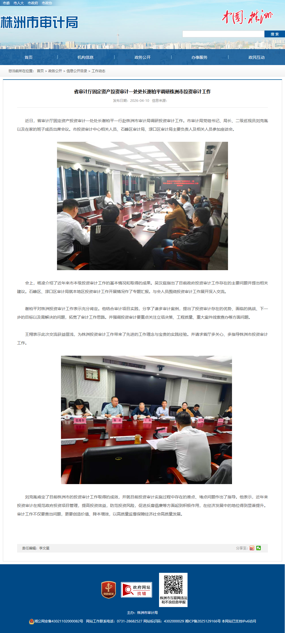 近日,省审计厅固定资产投资审计一处处长谢柏平一行赴株洲市审计局调研投资审计工作。市审计局党组书记、局长、二级巡视员刘克胤以及在家的班子成员出席会议。市投资审计中心相关人员、石峰区审计局、渌口区审计局主要负责人及相关人员参加座谈会。