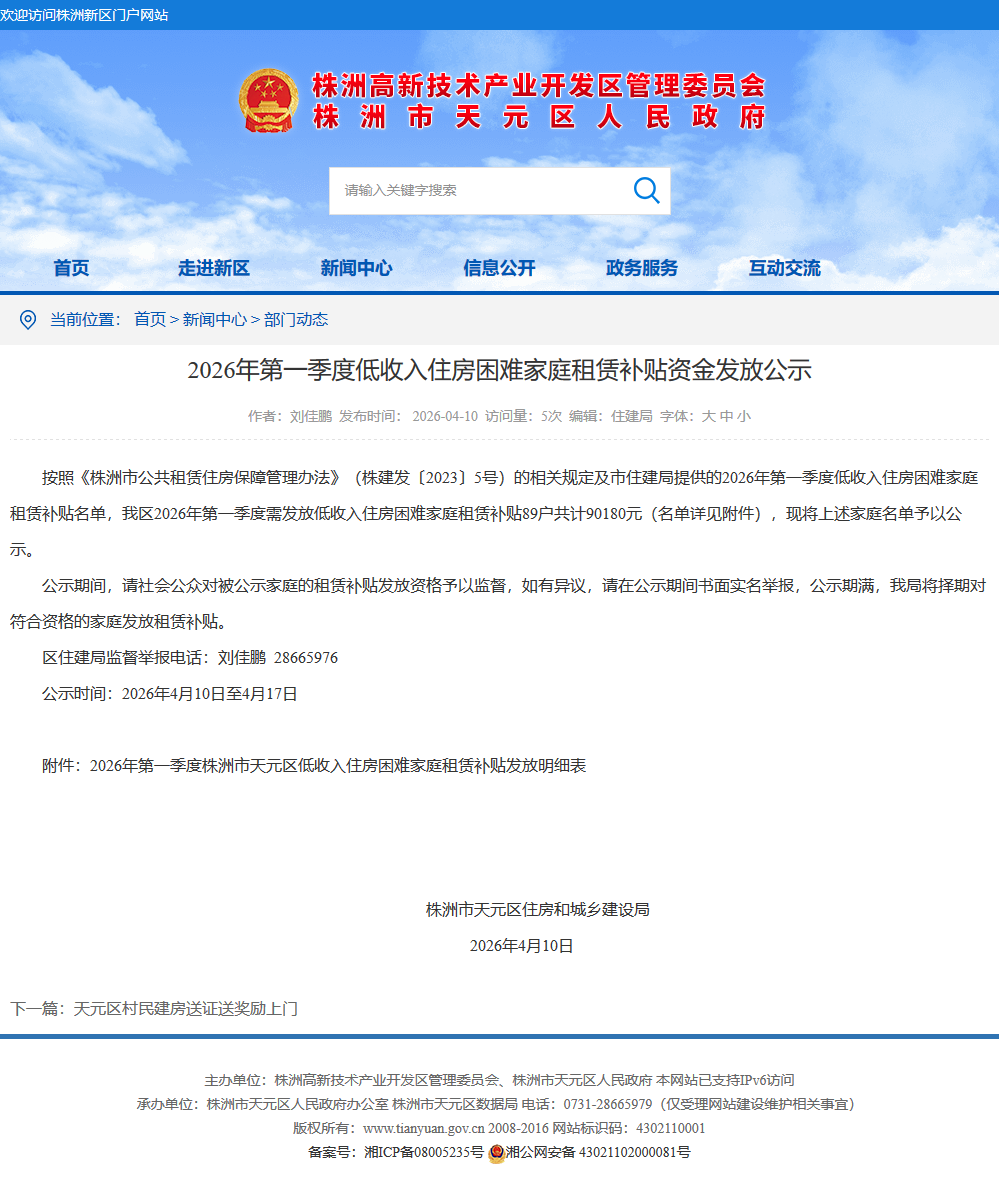 按照《株洲市公共租赁住房保障管理办法》(株建发〔2023〕5号)的相关规定及市住建局提供的2026年第一季度低收入住房困难家庭租赁补贴名单,我区2026年第一季度需发放低收入住房困难家庭租赁补贴89户共计90180元(名单详见附件),现将上述家庭名单予以公示。