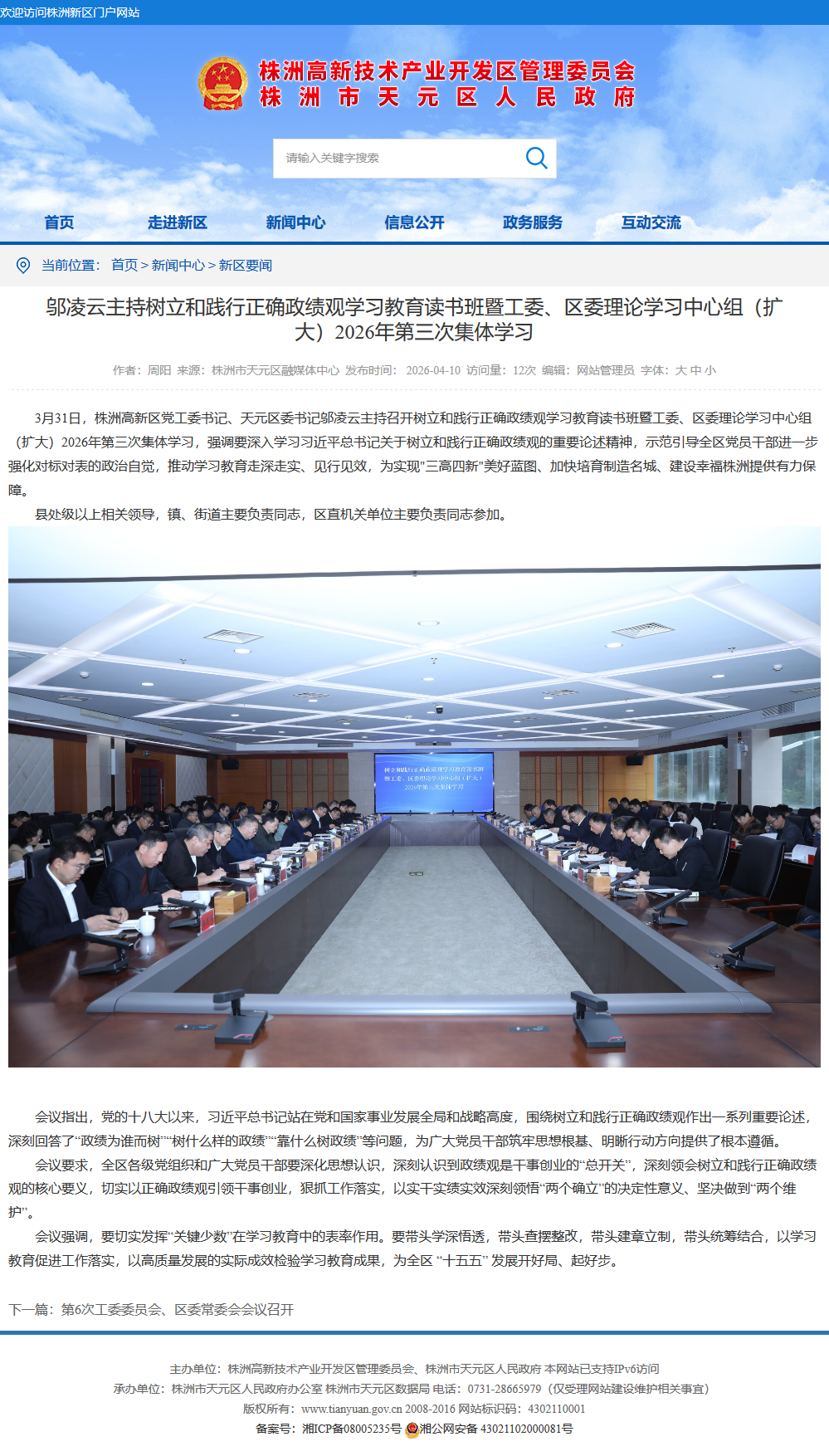 3月31日,株洲高新区党工委书记、天元区委书记邬凌云主持召开树立和践行正确政绩观学习教育读书班暨工委、区委理论学习中心组(扩大)2026年第三次集体学习,强调要深入学习习近平总书记关于树立和践行正确政绩观的重要论述精神,示范引导全区党员干部进一步强化对标对表的政治自觉,推动学习教育走深走实、见行见效,为实现"三高四新"美好蓝图、加快培育制造名城、建设幸福株洲提供有力保障。