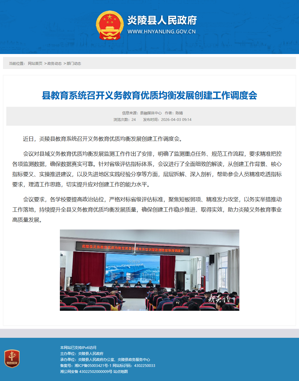 会议要求,各学校要提高政治站位,严格对标省级评估标准,聚焦短板弱项、精准发力攻坚,以务实举措推动工作落地,持续提升全县义务教育优质均衡发展质量,确保创建工作稳步推进、取得实效,助力炎陵义务教育事业高质量发展。
