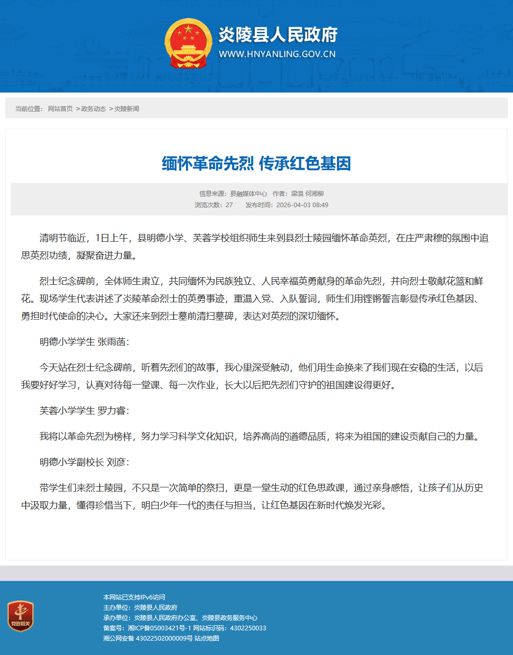烈士纪念碑前,全体师生肃立,共同缅怀为民族独立、人民幸福英勇献身的革命先烈,并向烈士敬献花篮和鲜花。现场学生代表讲述了炎陵革命烈士的英勇事迹,重温入党、入队誓词,师生们用铿锵誓言彰显传承红色基因、勇担时代使命的决心。大家还来到烈士墓前清扫墓碑,表达对英烈的深切缅怀。