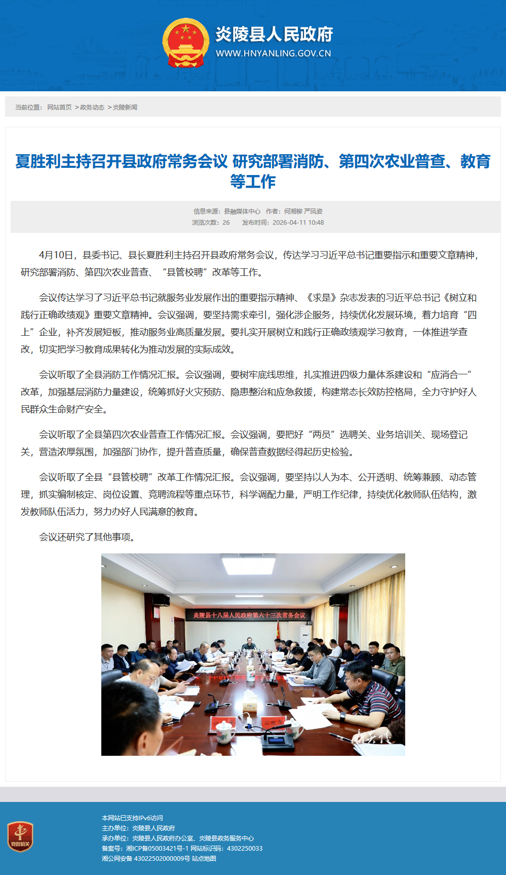 4月10日,县委书记、县长夏胜利主持召开县政府常务会议,传达学习习近平总书记重要指示和重要文章精神,研究部署消防、第四次农业普查、“县管校聘”改革等工作。