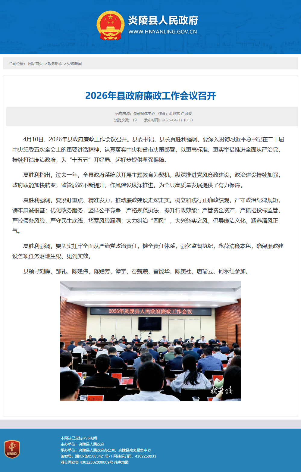 4月10日,2026年县政府廉政工作会议召开。县委书记、县长夏胜利强调,要深入贯彻习近平总书记在二十届中央纪委五次全会上的重要讲话精神,认真落实中央和省市决策部署,以更高标准、更实举措推进全面从严治党,持续打造廉洁政府,为“十五五”开好局、起好步提供坚强保障。