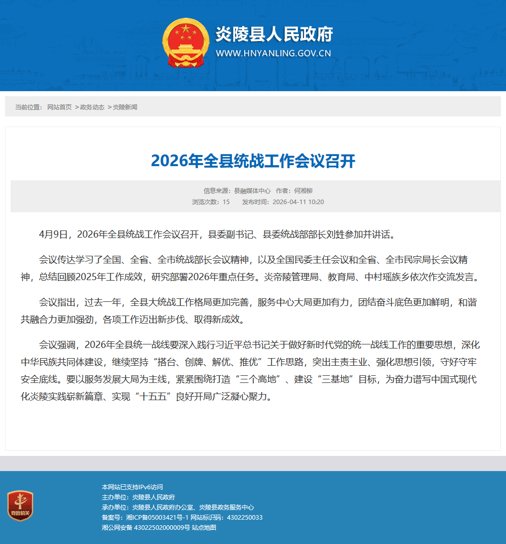 会议强调,2026年全县统一战线要深入践行习近平总书记关于做好新时代党的统一战线工作的重要思想,深化中华民族共同体建设,继续坚持“搭台、创牌、解优、推优”工作思路,突出主责主业、强化思想引领,守好守牢安全底线。要以服务发展大局为主线,紧紧围绕打造“三个高地”、建设“三基地”目标,为奋力谱写中国式现代化炎陵实践崭新篇章、实现“十五五”良好开局广泛凝心聚力。