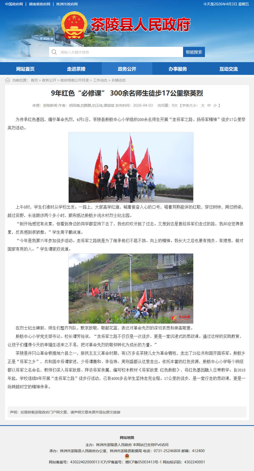 为传承红色基因,缅怀革命先烈,4月1日,茶陵县舲舫中心小学组织300余名师生开展“走将军之路、扬将军精神”徒步17公里祭英烈活动。