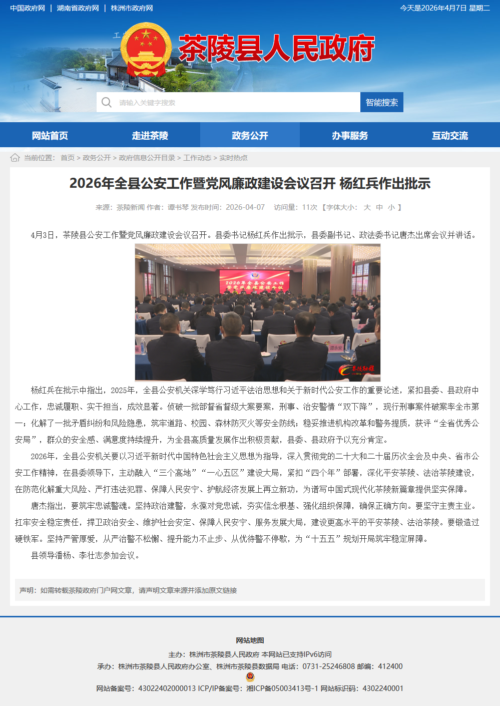 4月3日,茶陵县公安工作暨党风廉政建设会议召开。县委书记杨红兵作出批示,县委副书记、政法委书记唐杰出席会议并讲话。