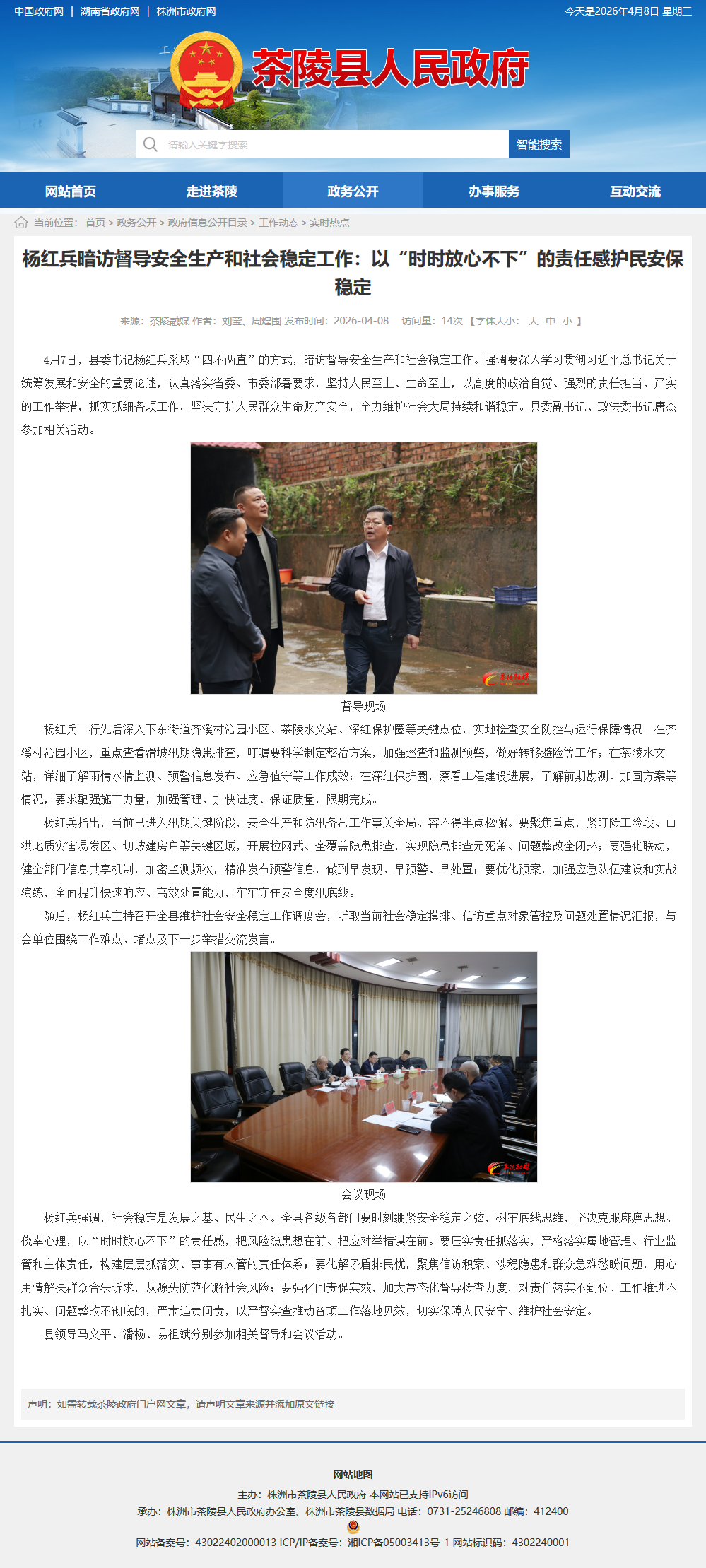 杨红兵指出,当前已进入汛期关键阶段,安全生产和防汛备汛工作事关全局、容不得半点松懈。要聚焦重点,紧盯险工险段、山洪地质灾害易发区、切坡建房户等关键区域,开展拉网式、全覆盖隐患排查,实现隐患排查无死角、问题整改全闭环;要强化联动,健全部门信息共享机制,加密监测频次,精准发布预警信息,做到早发现、早预警、早处置;要优化预案,加强应急队伍建设和实战演练,全面提升快速响应、高效处置能力,牢牢守住安全度汛底线。