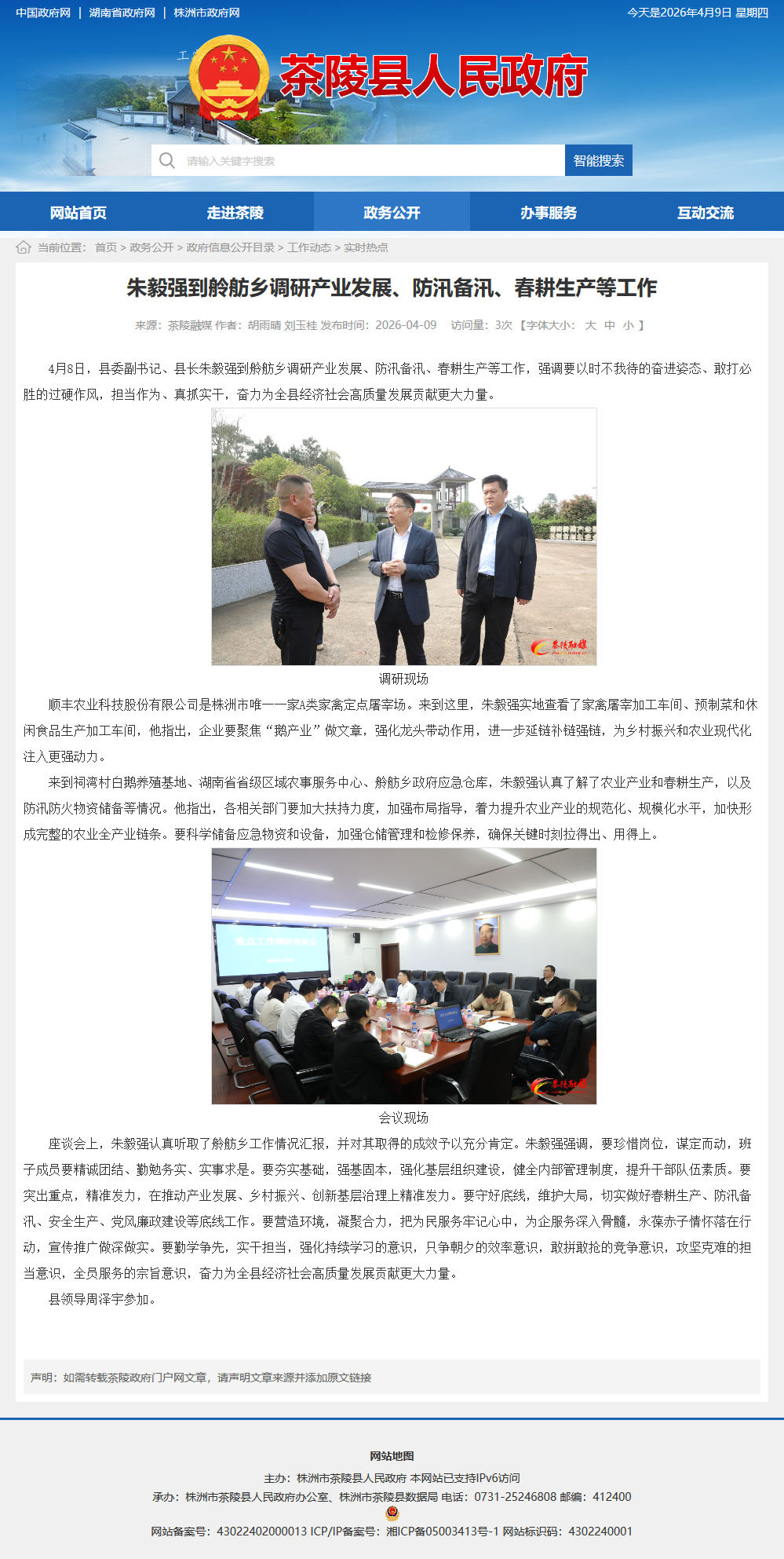 4月8日,县委副书记、县长朱毅强到舲舫乡调研产业发展、防汛备汛、春耕生产等工作,强调要以时不我待的奋进姿态、敢打必胜的过硬作风,担当作为、真抓实干,奋力为全县经济社会高质量发展贡献更大力量。