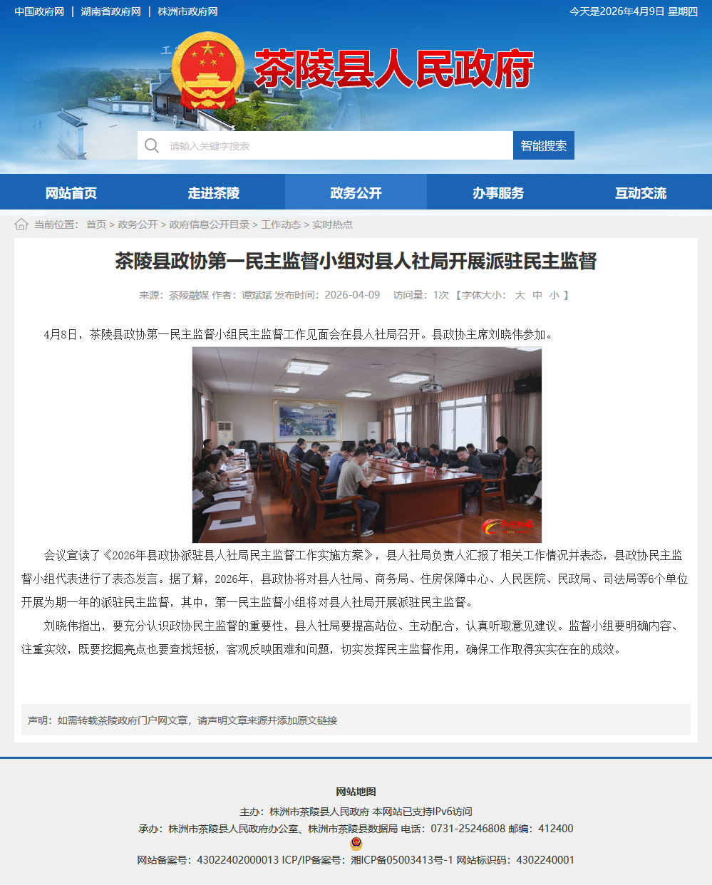 4月8日,茶陵县政协第一民主监督小组民主监督工作见面会在县人社局召开。县政协主席刘晓伟参加。