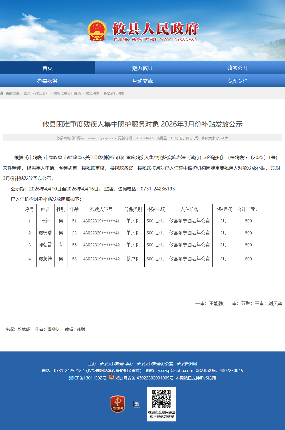 根据《市残联 市民政局 市财政局<关于印发株洲市困难重度残疾人集中照护实施办法(试行)>的通知》(株残联字〔2025〕1号)文件精神,经当事人申请、乡镇初审,县残联审核,县民政备案,县残联按月对已入住集中照护机构困难重度残疾人对象发放补贴,现对3月份补贴发放予以公示。