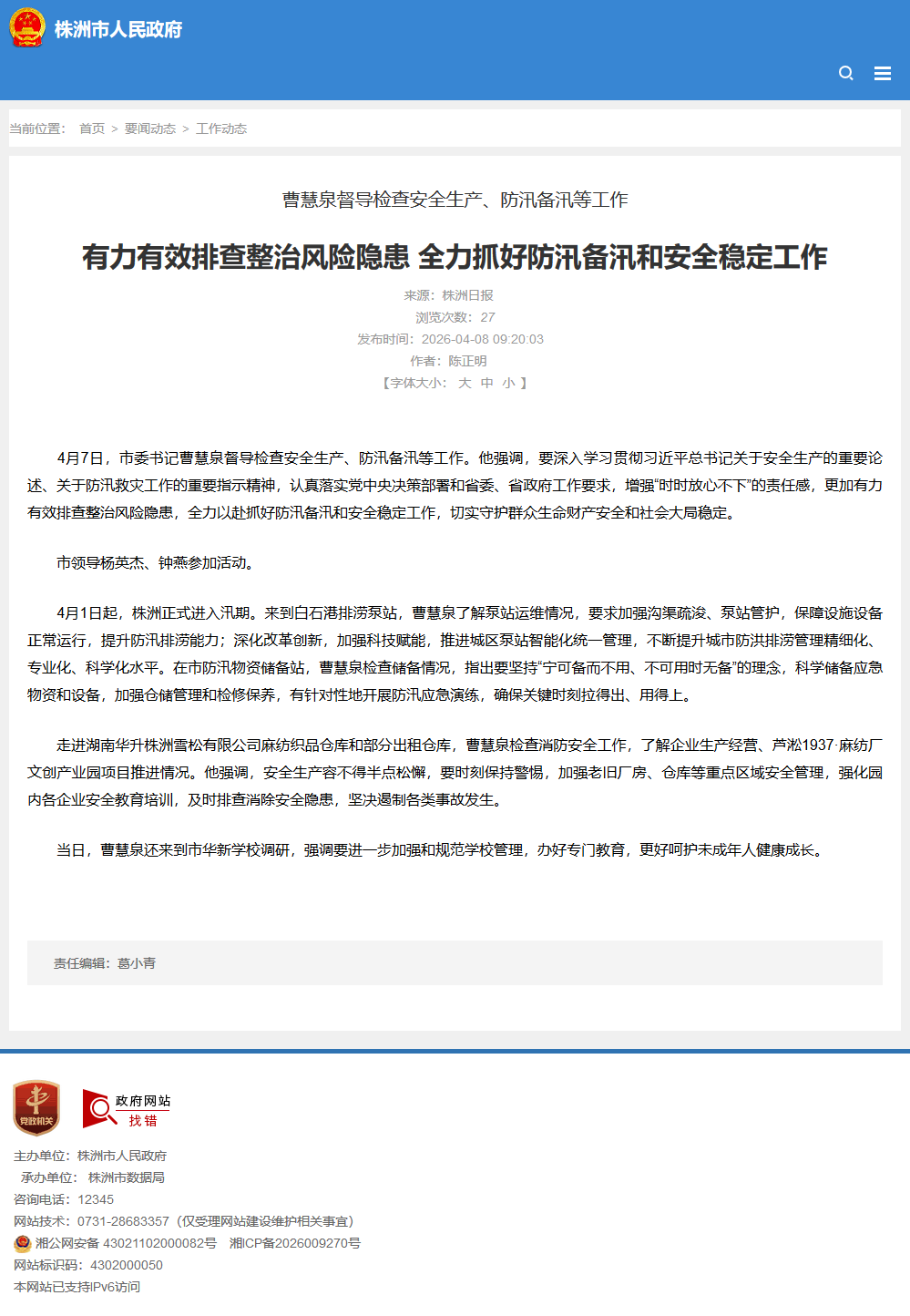 4月7日,市委书记曹慧泉督导检查安全生产、防汛备汛等工作。他强调,要深入学习贯彻习近平总书记关于安全生产的重要论述、关于防汛救灾工作的重要指示精神,认真落实党中央决策部署和省委、省政府工作要求,增强“时时放心不下”的责任感,更加有力有效排查整治风险隐患,全力以赴抓好防汛备汛和安全稳定工作,切实守护群众生命财产安全和社会大局稳定。