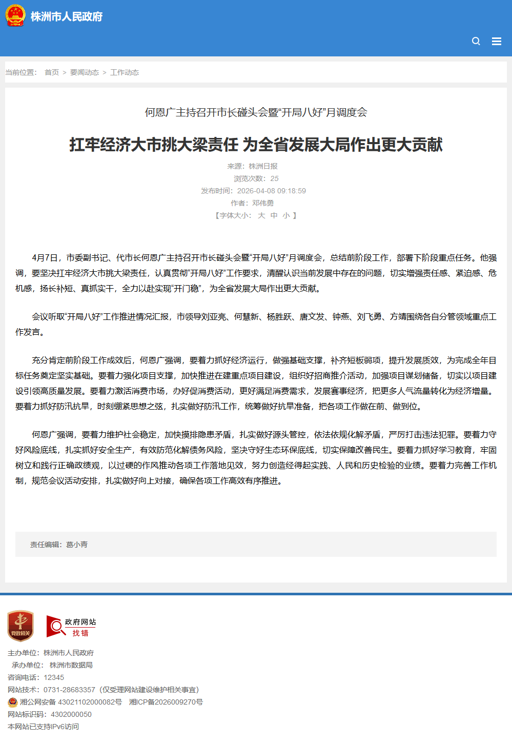 4月7日,市委副书记、代市长何恩广主持召开市长碰头会暨“开局八好”月调度会,总结前阶段工作,部署下阶段重点任务。他强调,要坚决扛牢经济大市挑大梁责任,认真贯彻“开局八好”工作要求,清醒认识当前发展中存在的问题,切实增强责任感、紧迫感、危机感,扬长补短、真抓实干,全力以赴实现“开门稳”,为全省发展大局作出更大贡献。