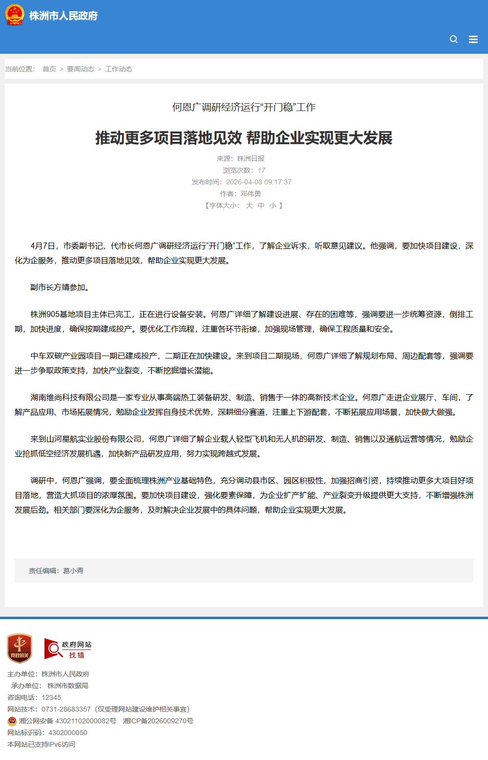 调研中,何恩广强调,要全面梳理株洲产业基础特色,充分调动县市区、园区积极性,加强招商引资,持续推动更多大项目好项目落地,营造大抓项目的浓厚氛围。要加快项目建设,强化要素保障,为企业扩产扩能、产业裂变升级提供更大支持,不断增强株洲发展后劲。相关部门要深化为企服务,及时解决企业发展中的具体问题,帮助企业实现更大发展。