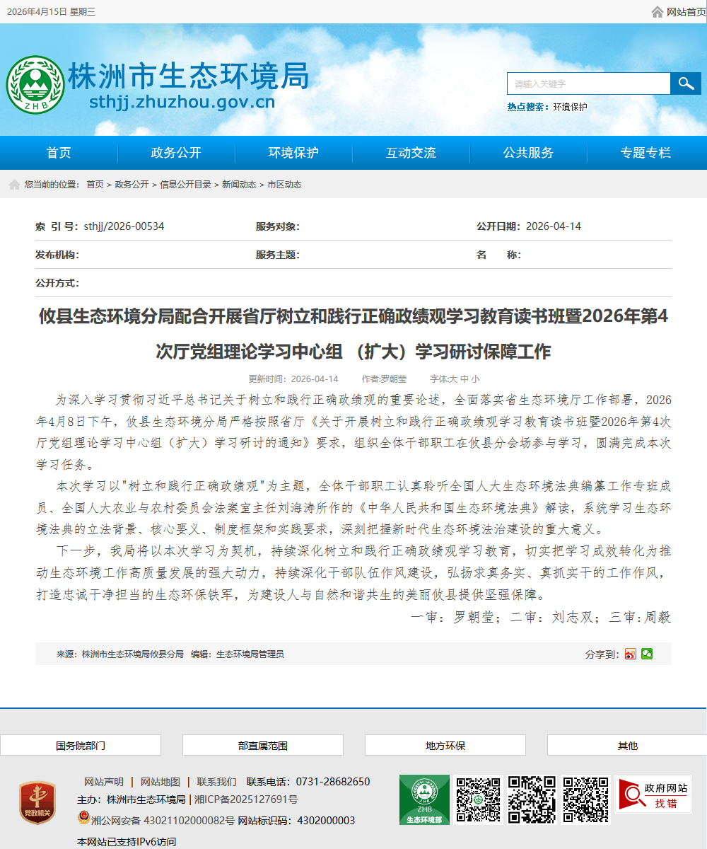 为深入学习贯彻习近平总书记关于树立和践行正确政绩观的重要论述,全面落实省生态环境厅工作部署,2026年4月8日下午,攸县生态环境分局严格按照省厅《关于开展树立和践行正确政绩观学习教育读书班暨2026年第4次厅党组理论学习中心组(扩大)学习研讨的通知》要求,组织全体干部职工在攸县分会场参与学习,圆满完成本次学习任务。