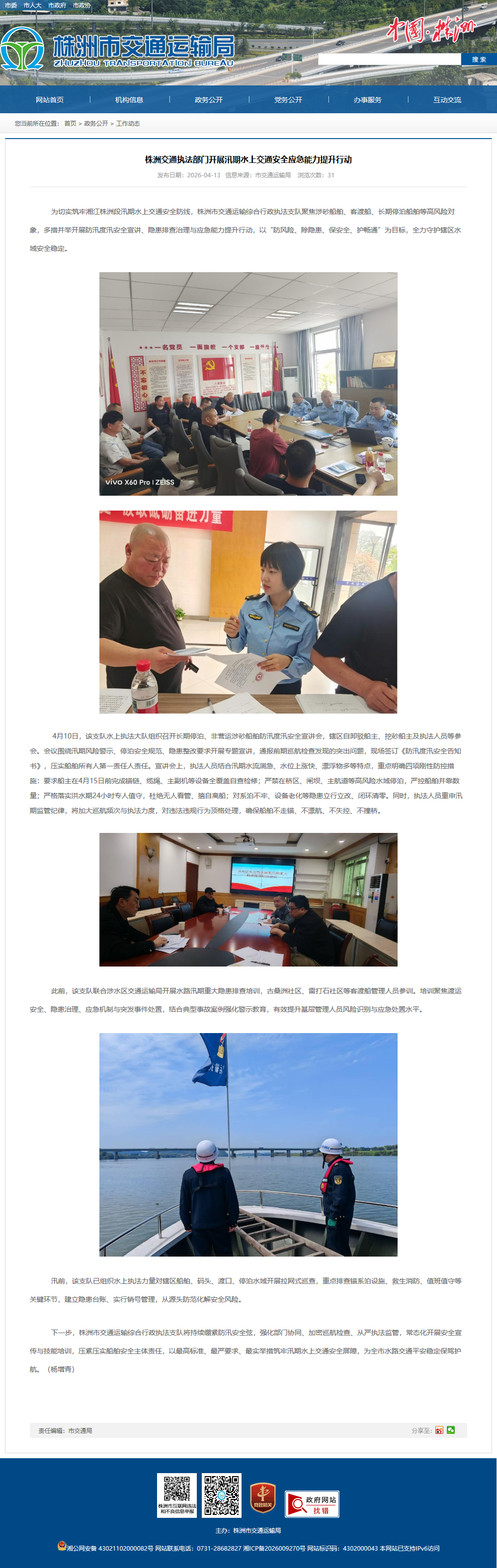 下一步,株洲市交通运输综合行政执法支队将持续绷紧防汛安全弦,强化部门协同、加密巡航检查、从严执法监管,常态化开展安全宣传与技能培训,压紧压实船舶安全主体责任,以最高标准、最严要求、最实举措筑牢汛期水上交通安全屏障,为全市水路交通平安稳定保驾护航。(杨增青)
