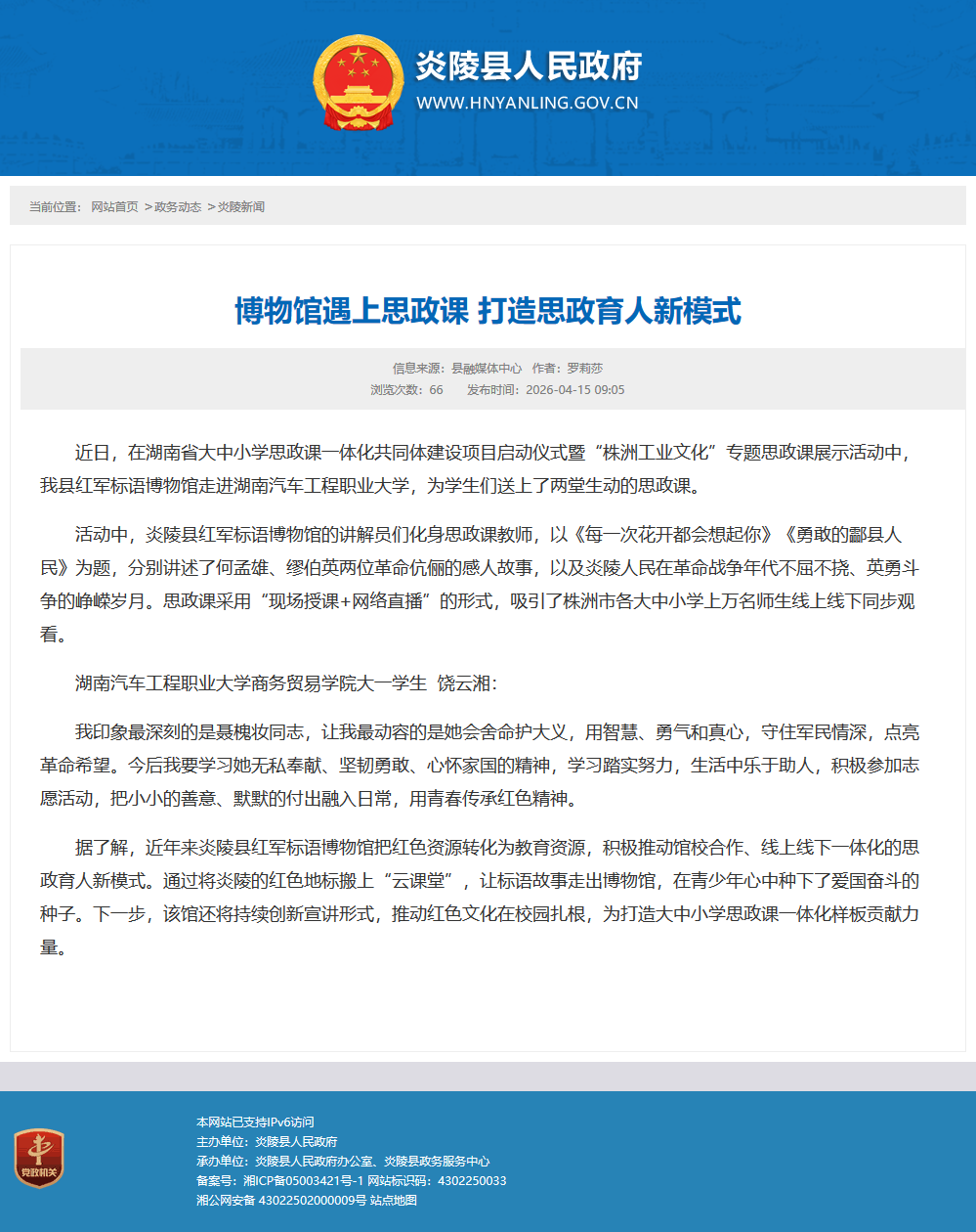 据了解,近年来炎陵县红军标语博物馆把红色资源转化为教育资源,积极推动馆校合作、线上线下一体化的思政育人新模式。通过将炎陵的红色地标搬上“云课堂”,让标语故事走出博物馆,在青少年心中种下了爱国奋斗的种子。下一步,该馆还将持续创新宣讲形式,推动红色文化在校园扎根,为打造大中小学思政课一体化样板贡献力量。
