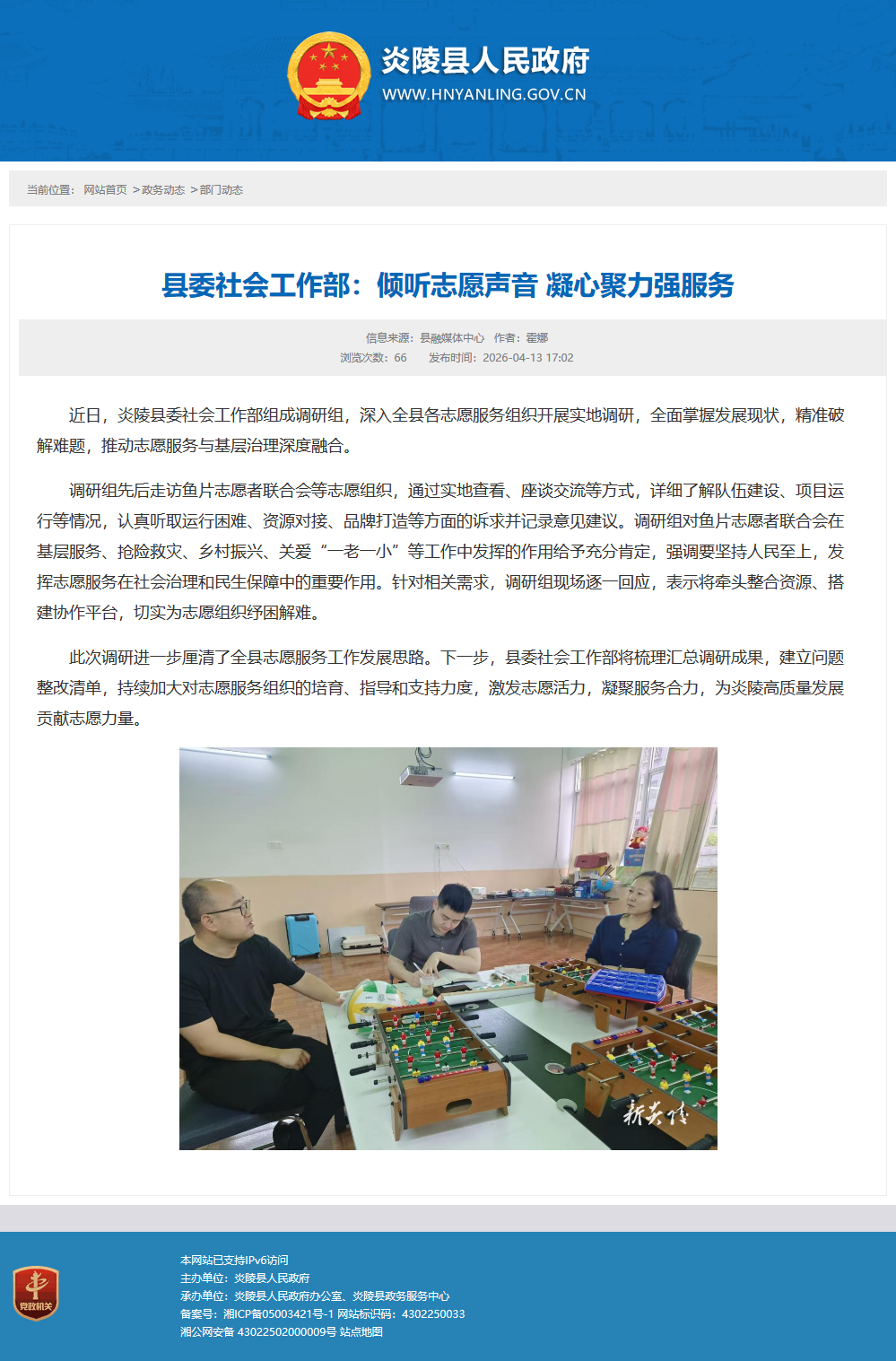 近日,炎陵县委社会工作部组成调研组,深入全县各志愿服务组织开展实地调研,全面掌握发展现状,精准破解难题,推动志愿服务与基层治理深度融合。
