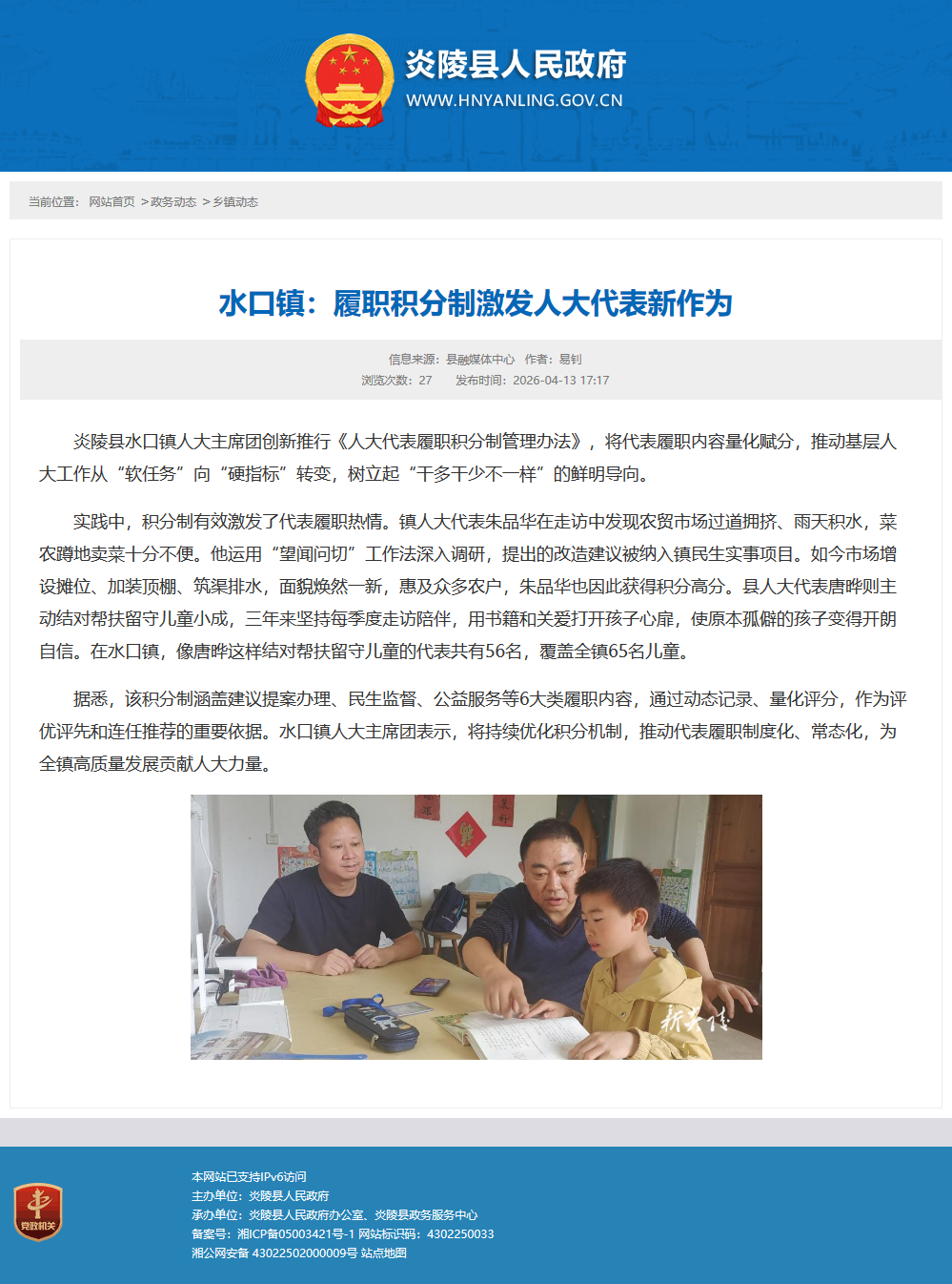 炎陵县水口镇人大主席团创新推行《人大代表履职积分制管理办法》,将代表履职内容量化赋分,推动基层人大工作从“软任务”向“硬指标”转变,树立起“干多干少不一样”的鲜明导向。