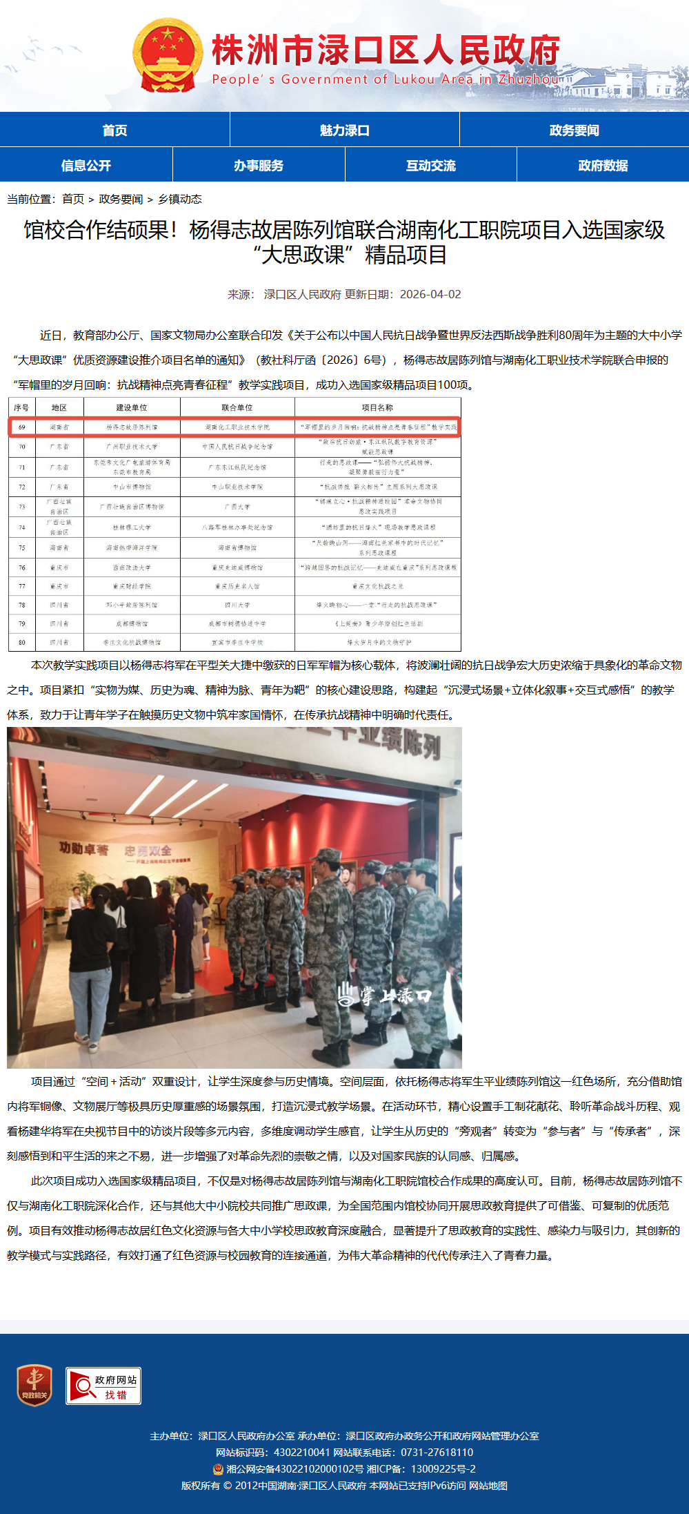 近日,教育部办公厅、国家文物局办公室联合印发《关于公布以中国人民抗日战争暨世界反法西斯战争胜利80周年为主题的大中小学“大思政课”优质资源建设推介项目名单的通知》(教社科厅函〔2026〕6号),杨得志故居陈列馆与湖南化工职业技术学院联合申报的“军帽里的岁月回响:抗战精神点亮青春征程”教学实践项目,成功入选国家级精品项目100项。