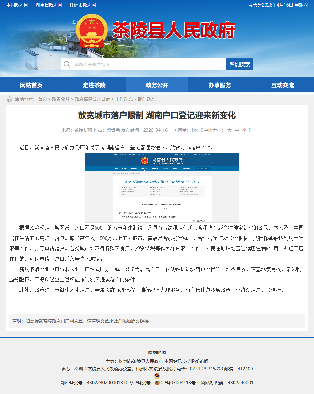近日,湖南省人民政府办公厅印发了《湖南省户口登记管理办法》,放宽城市落户条件。