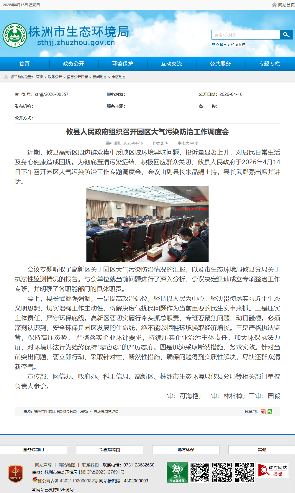 近期,攸县高新区周边群众集中反映区域环境异味问题,投诉量显著上升,对居民日常生活及身心健康造成困扰。为彻底查清污染症结、积极回应群众关切,攸县人民政府于2026年4月14日下午召开园区大气污染防治工作专题调度会。会议由副县长朱晶娟主持,县长武挪强出席并讲话。