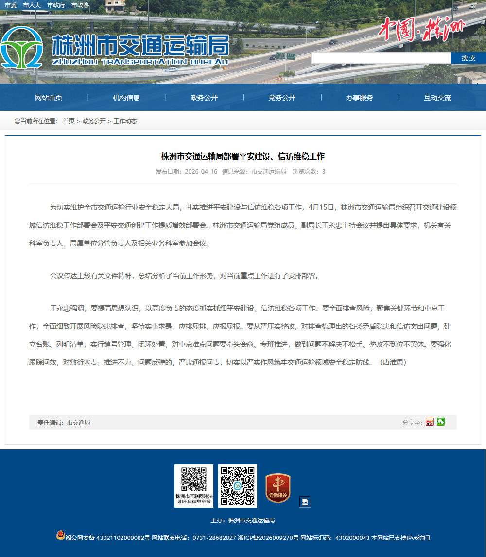 为切实维护全市交通运输行业安全稳定大局,扎实推进平安建设与信访维稳各项工作,4月15日,株洲市交通运输局组织召开交通建设领域信访维稳工作部署会及平安交通创建工作提质增效部署会。株洲市交通运输局党组成员、副局长王永忠主持会议并提出具体要求,机关有关科室负责人、局属单位分管负责人及相关业务科室参加会议。