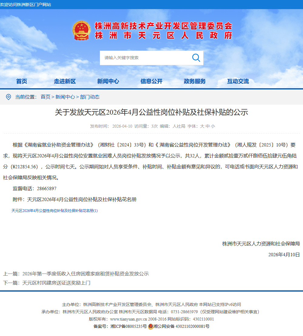 根据《湖南省就业补助资金管理办法》(湘财社〔2024〕33号)和《 湖南省公益性岗位开发管理办法》(湘人规发〔2025〕10号)要求,现将天元区2026年4月公益性岗位安置就业困难人员岗位补贴发放情况予以公示,共32人,累计金额贰拾壹万贰仟捌佰伍拾肆元伍角陆分(¥212854.56),公示时间七天。公示期间如对人员享受条件、补贴时间、补贴金额有意见和异议的,可电话或书面向天元区人力资源和社会保障局反映相关情况。