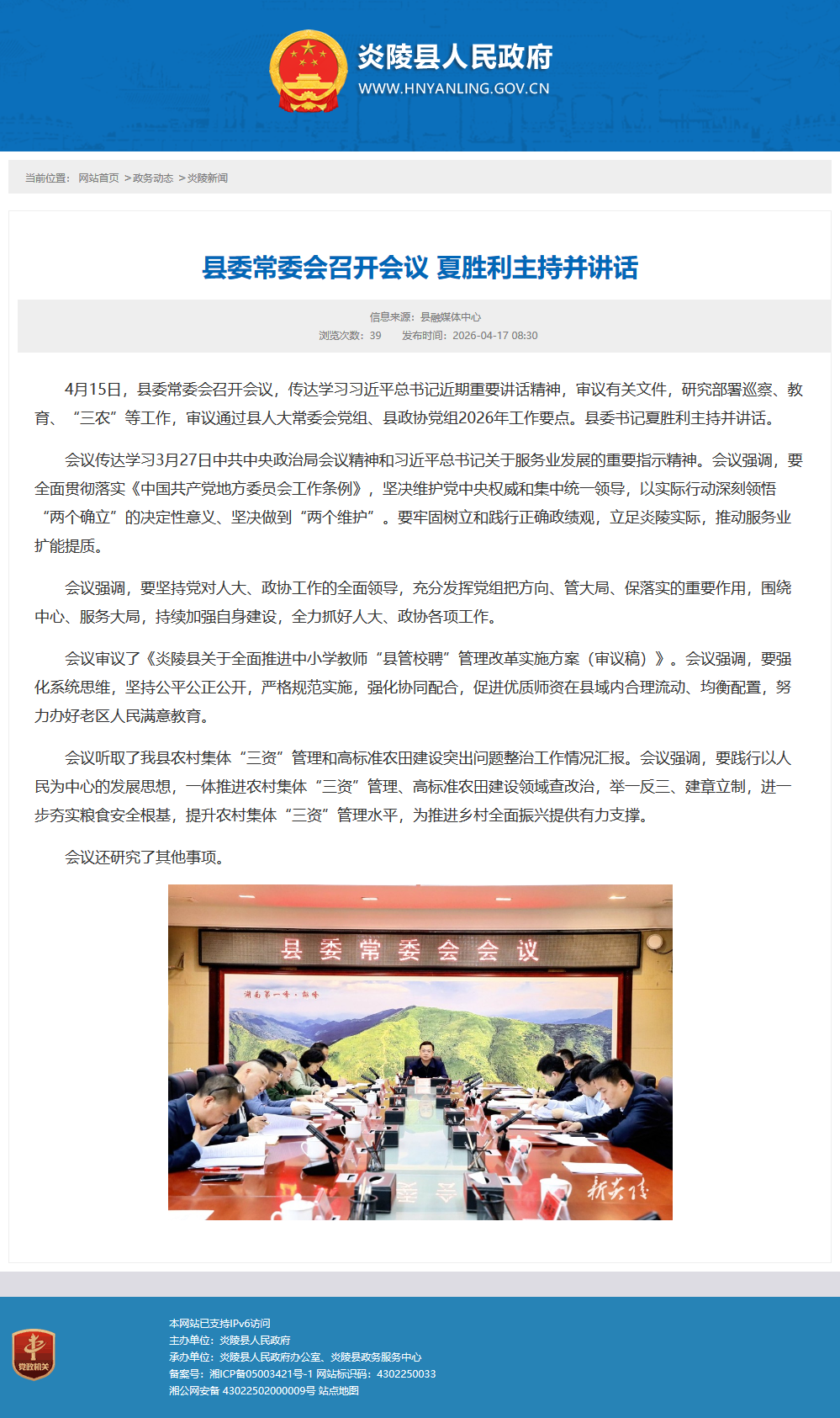 4月15日,县委常委会召开会议,传达学习习近平总书记近期重要讲话精神,审议有关文件,研究部署巡察、教育、“三农”等工作,审议通过县人大常委会党组、县政协党组2026年工作要点。县委书记夏胜利主持并讲话。