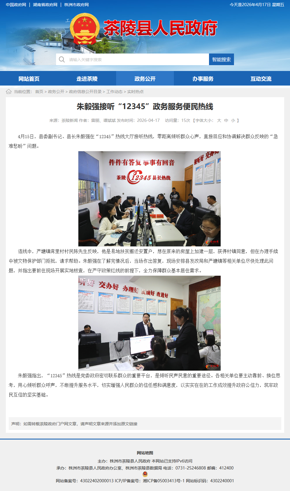 4月15日,县委副书记、县长朱毅强在“12345”热线大厅接听热线,零距离倾听群众心声,直接回应和协调解决群众反映的“急难愁盼”问题。