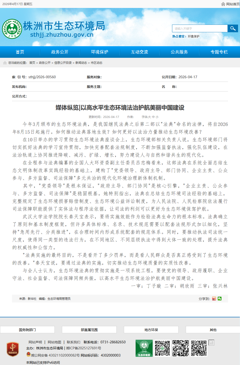 今年3月颁布的生态环境法典,是我国继民法典之后第二部以"法典"命名的法律,将自2026年8月15日起施行。如何推动法典落地生效?如何更好以法治力量推动生态环境改善?