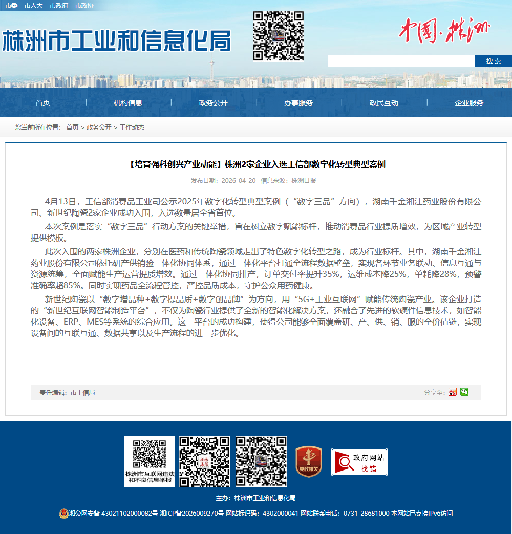 4月13日,工信部消费品工业司公示2025年数字化转型典型案例(“数字三品”方向),湖南千金湘江药业股份有限公司、新世纪陶瓷2家企业成功入围,入选数量居全省首位。